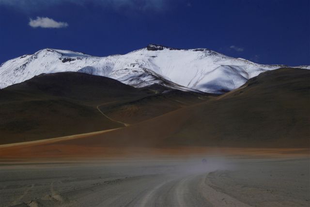 La deuxième tentative sera la bonne. Quelques heures plus tard, nous reprenons la route, qui longe un canyon sur 2600 m de dénivelé, et ne déplorons pas la moindre surchauffe. C´est là que l´on débouche sur l´Altipano : un immense plateau entouré de sommets culminant à plus de 6000m, et formé presque exclusivement de désert de sable, de roche, de toutes les couleurs… Cette route est la seule qui permet de rejoindre le Chili par le nord de l´Argentine… Nous ne sommes donc pas seuls, mais tout de même, quel sentiment…