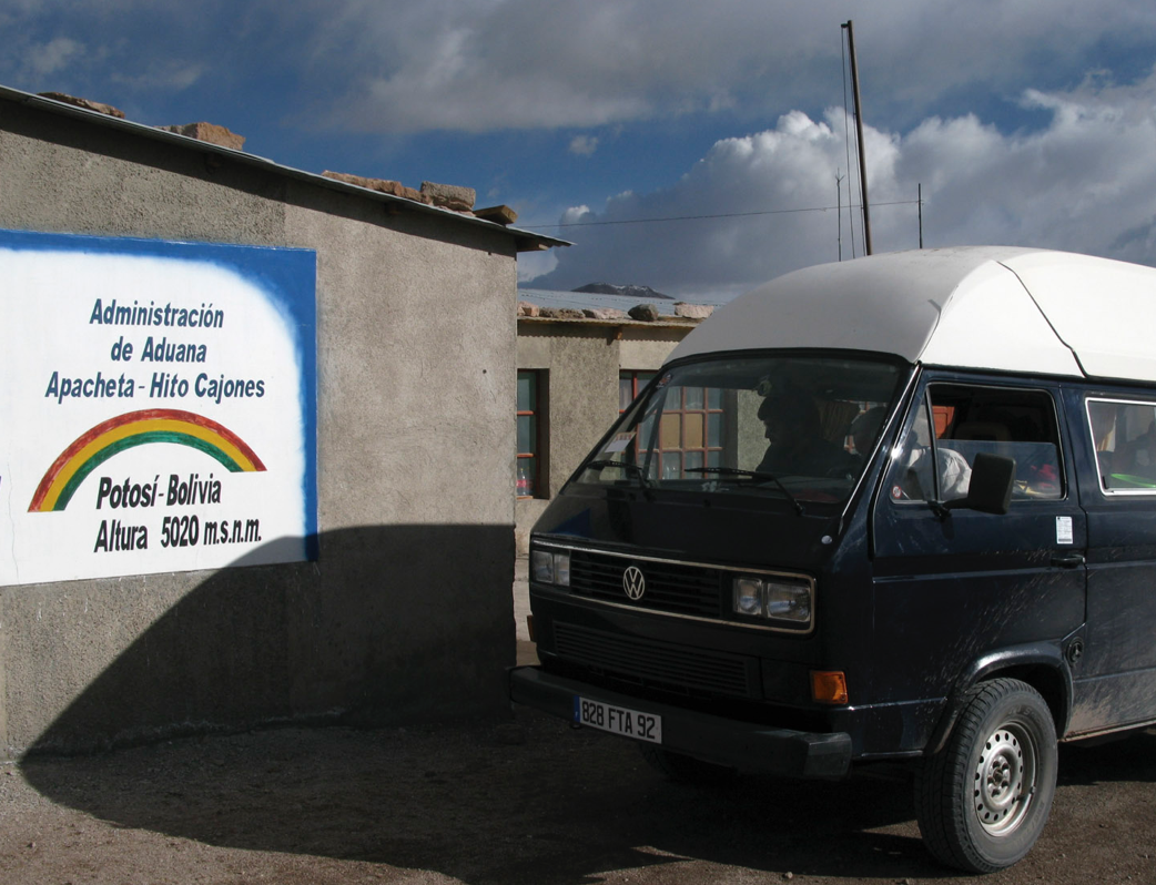 Nous ne nous attardons pas, car avant la laguna colorada où nous avons prévu de passer la nuit, il reste 200km de pistes (5h sans jamais faire fausse route). Et nous devons aussi aller faire tamponner le carnet de passage en douane de la voiture dans un autre poste de douane, qui sert aussi de poste de surveillance d´une usine chimique perchée à 5020 m d´altitude, un record pour tout le monde et surtout pour la voiture! Nous y surprenons un douanier en plein ‘tchat’ sur internet… Internet, à 5020m d’altitude, dans le désert de l’Altipano !